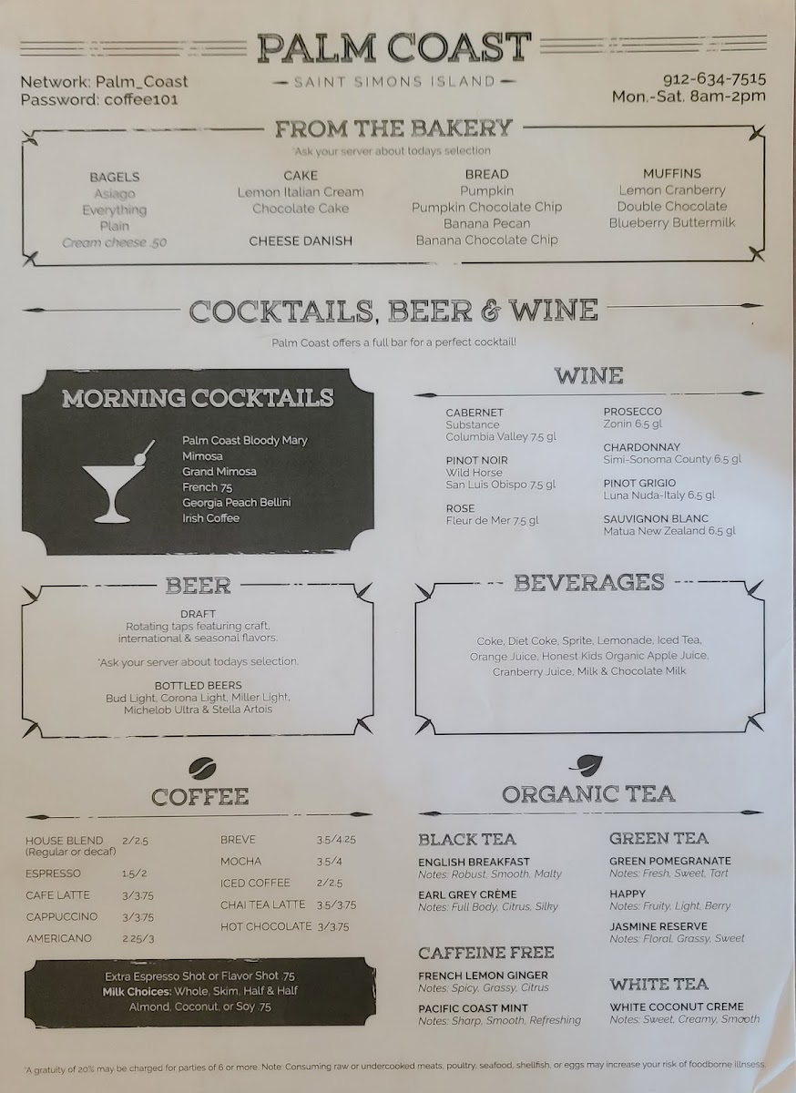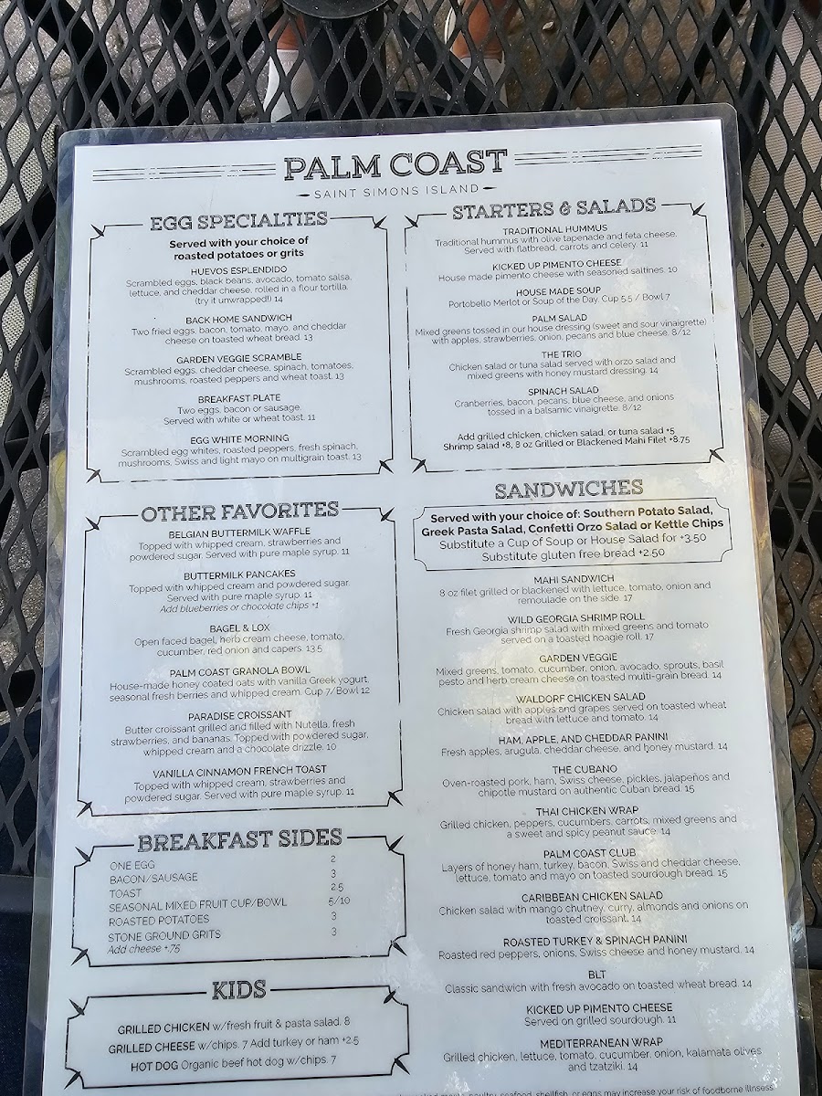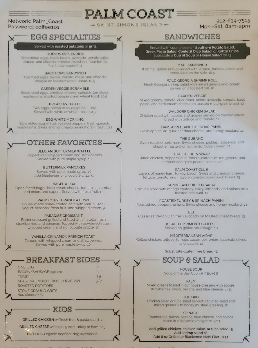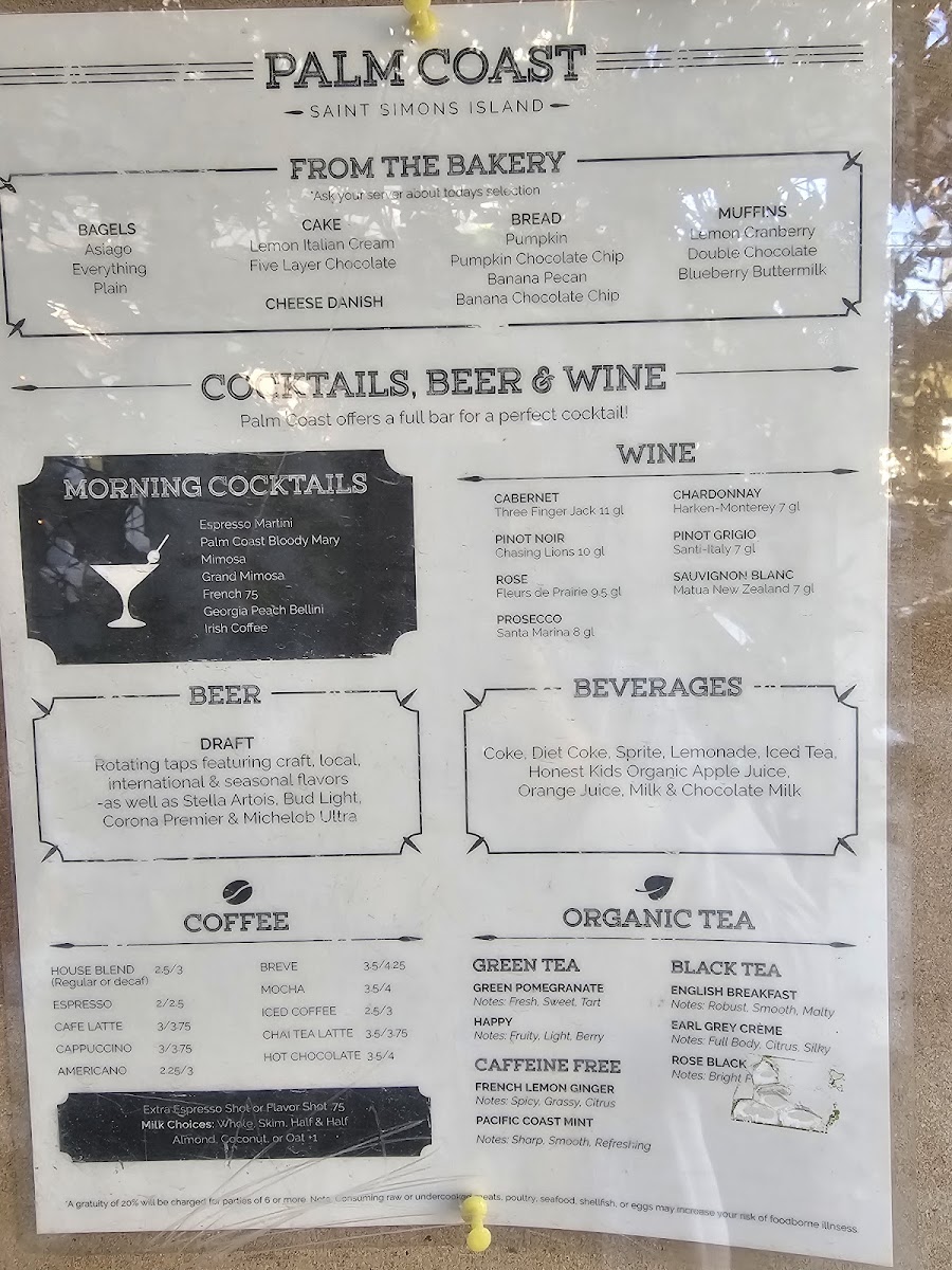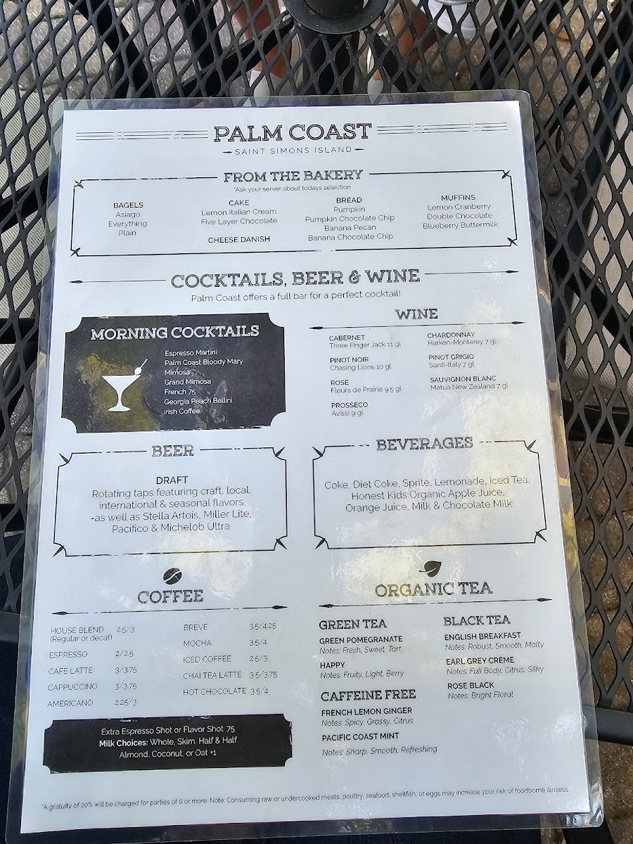 At Palm Coast, you’re in for a treat with a menu packed full of fresh, flavorful dishes that showcase the best of coastal cuisine. Located at 318 Mallery St in St Simons Island, GA, this spot is the perfect place to relax and enjoy a meal with friends or family. Whether you're craving seafood, classic Southern comfort foods, or something unique, Palm Coast Menu has something for everyone. From tender shrimp and grits to expertly prepared steaks, the menu offers a variety of options to suit every taste. Pair your meal with a refreshing drink from their selection, and you’ve got the perfect dining experience. With a laid-back atmosphere and dishes made from the freshest ingredients, dining here feels like a true getaway.